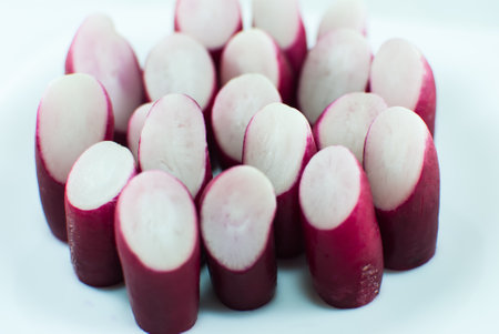 Sliced red-purple radish on white background