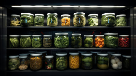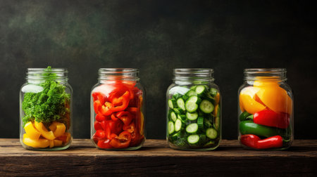 Discover a visually stunning arrangement of preserved fresh vegetables in glass jars, showcasing vibrant colors ideal for healthy eating and culinary inspiration.
