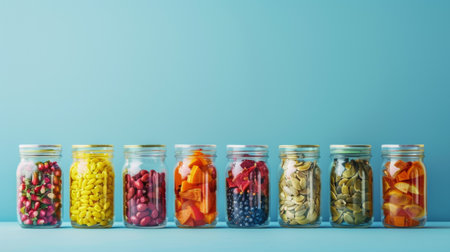 A row of glass jars filled with various dried foods, including fruits, nuts, and seeds, arranged against a light blue background, showing healthy and preserved food options.