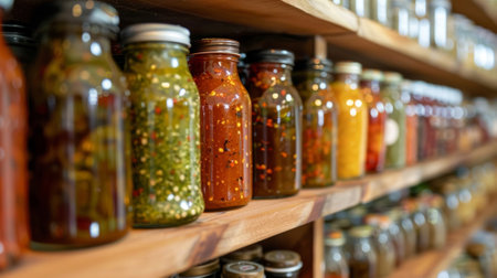 A vibrant arrangement of jars filled with preserved fruits and vegetables showcases the art of canning, bringing warmth and color to a charming kitchen atmosphere.