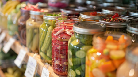 A visually appealing display of colorful jars filled with various pickled vegetables and fruits, garnished with fresh herbs, ideal for food lovers and culinary enthusiasts.