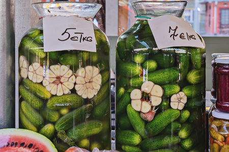 Large jars of pickled cucumbers with garlic, labeled with prices, displayed at an outdoor market stall