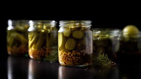 Canned pickled cucumbers in jars closeup, homemade pickles, canning food, marinated cucumbers, canning vegetables selective, focus, generative ai illustration