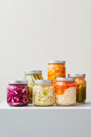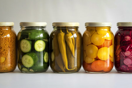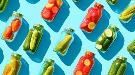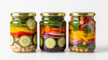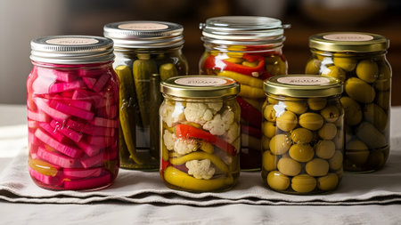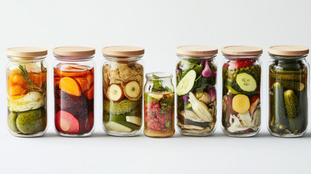 Vibrant jars filled with assorted pickled vegetables create an appealing arrangement against a bright background, perfect for culinary or lifestyle themes.