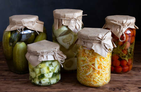 Canned vegetables in jars. Pickled cucumbers, tomatoes, cabbage, zucchini and squash on a wooden table. Horizontal orientation