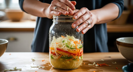 Closeup of woman's hands preparing vegetable salad in glass jar at kitchen