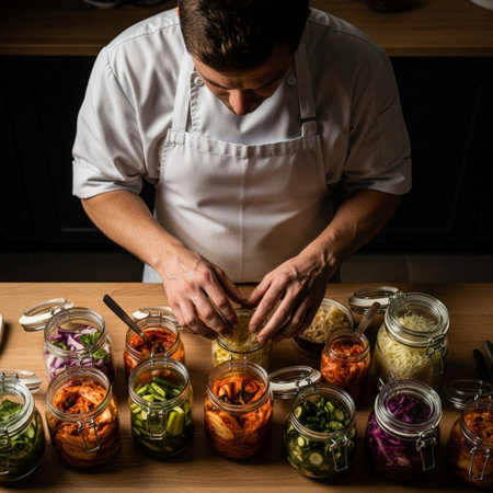 A cinematic, high angle top-down view of a professional chef demonstrating fermentation techniques d