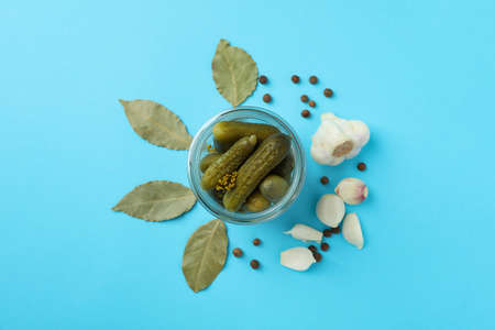Pickled cucumbers in a jar with herbs and spices. Sliced pickled cucumber. Healthy fermented food.