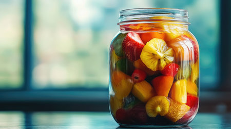 Glass jar filled with preserved fruit, vibrant colors contrasting with the transparent jar