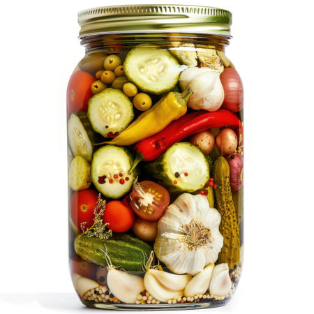 A vibrant glass jar filled with an array of pickled vegetables, including cucumbers, tomatoes, garlic, and colorful spices, perfect for enhancing meals.