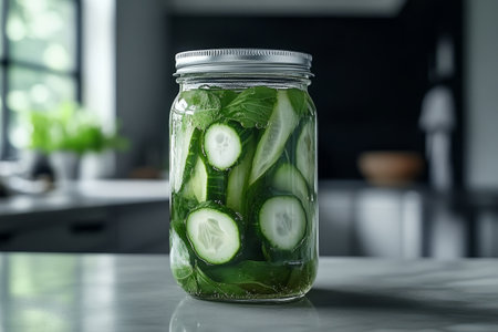 Pickled cucumbers in a glass jar on the table in the modern kitchen. Homemade fermented food and preserved vegetables concept