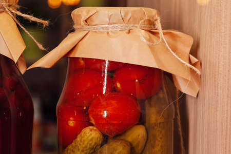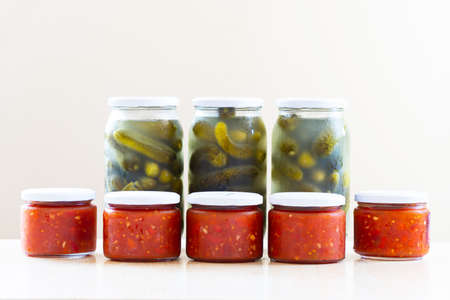 Food preserving for autumn winter time. Jars with pickled vegetables in cellar