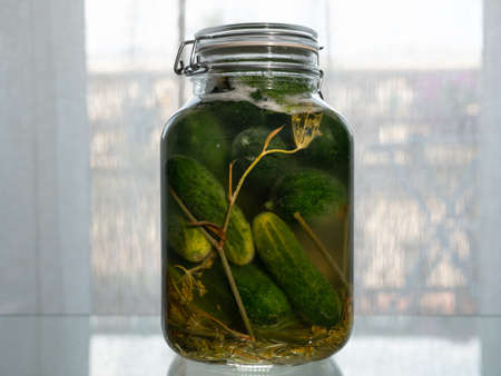 Pickled cucumbers - stand on the table in the window, blurry light background