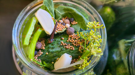 Jars with cucumbers and spices for preservation. Fermentation of cucumbers, winter preparations. Cloves, chili peppers, mustard, dill, brine. Harvest