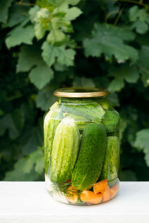 A can of canned cucumbers with carrots on a natural background. Pickled vegetables.