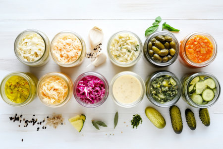 Fermented food panorama, overhead flat lay shot. Vegetable preserves. Sauerkraut, pickles, kimchi etc in glass jars. Canning in vinegar for winter