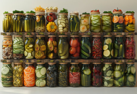 Creative and Colorful Presentation of Diverse Pickled Vegetables in Glass Jars, Art of Preservation.