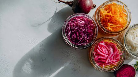 Jars filled with pickled vegetables like red cabbage, carrots, and beets on a light surface, highlighting vibrant colors and healthy food preparation methods