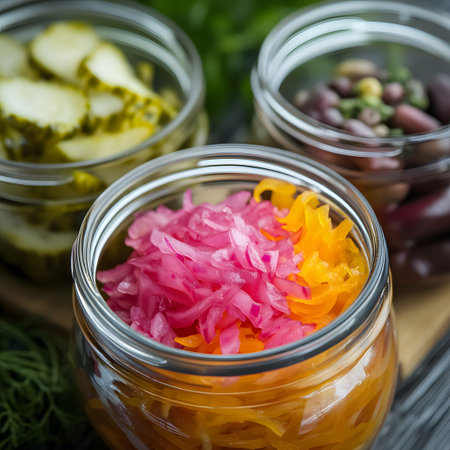 A vibrant display of glass jars filled with preserved vegetables, showcasing colorful pickles and homemade ingredients. Perfect for food enthusiasts and culinary projects.