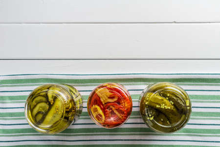 Open glass jars with canned vegetables on a white wooden table. Artichoke in oil, pickled gherkins and small red hot peppers are ready to eat. Fermented organic vegetable snacks and condiments. Copy space.