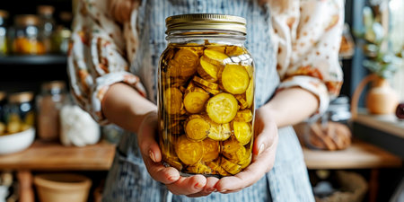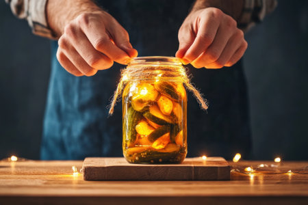 A person sealing a jar of pickles surrounded by warm lights, showcasing the art of home preservation and delicious flavors.