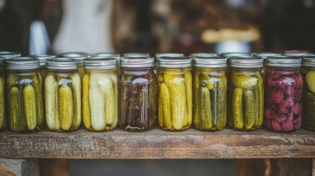 A vibrant display of jars filled with various pickles on a rustic wooden shelf, showcasing the art of preservation and homemade delights. Perfect for culinary-themed projects.