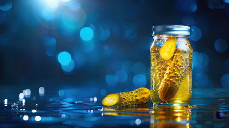 A stunning jar of fresh pickles sits on a reflective surface, showcasing vibrant hues of yellow and blue, creating an appealing food photography scene.