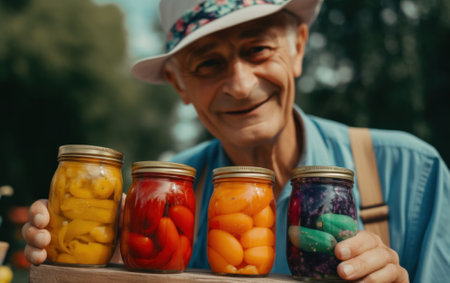 A senior woman holding a jar of homemade jam in her hands. Banner. Copy space