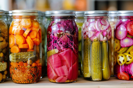 A vibrant display of colorful jars filled with pickled vegetables, showcasing a variety of fresh ingredients perfect for home preservation and culinary delights.