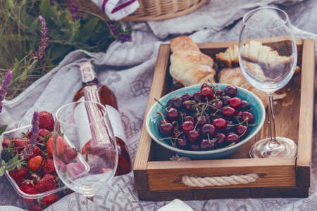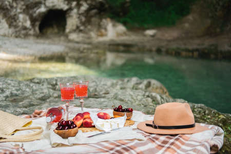 Cozy summer picnic near the lake with wine, cherry, peaches, brie cheese, camamber. Romantic picnic for Valentines Day on February 14.