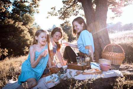 Careful mother share tasty sandwich between children on park picnic close up. Beautiful smiling mother feeding hungry kids on green lawn on sunny day. Happy family eat delicious snacks on nature.