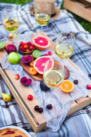 Picnic in garden with glasses of red wine, cheese, fruits and bread in summer sunny day.