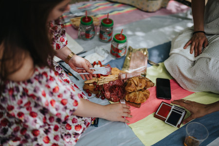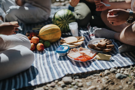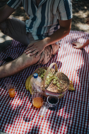 Picnic in the park: family and friends enjoy fruit, juice, and snacks on a sunny day