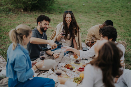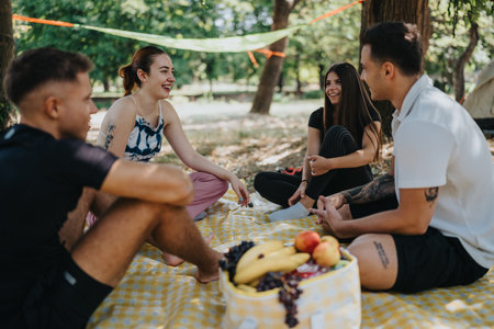 Young friends enjoying a picnic and conversation outdoors in a scenic park