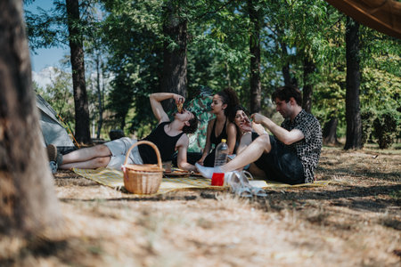 Friends enjoy a relaxed forest picnic and camping moment with tents, blanket, and snacks