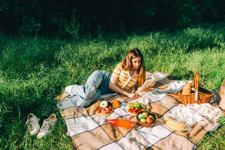 Young woman reading book outdoors, in natural park on picnic, lying on a picnic blanket and enjoying summer weather.