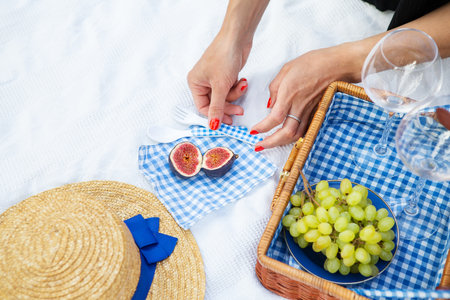 Romantic picnic in the park on the grass, delicious food: basket, wine, grapes, figs, cheese, blue checkered tablecloth, two glasses of wine. Girl cuts figs.Outdoor recreation concept