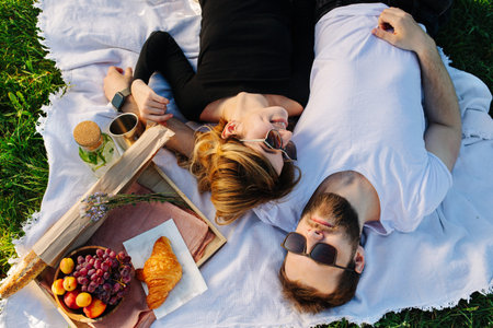 Happy couple resting on a blanket during picnic next to food box with fruits, bakery products and lemonade.