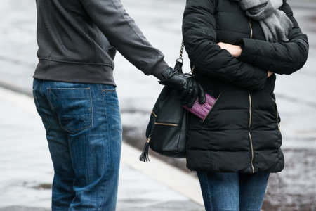 Midsection of young male robber stealing clutch from woman's jacket on street during winter