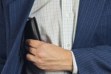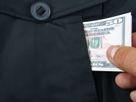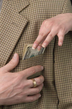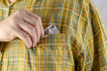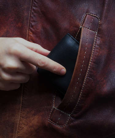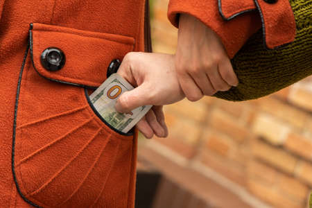 A hand takes out money from a jacket pocket. Theft. Robbery. Place for text.