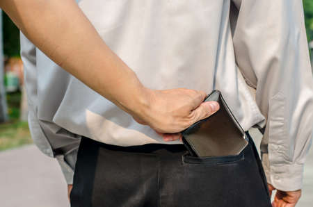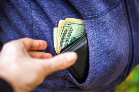 The hand of the white man pulls out a wallet from another's pocket. The concept of stealing money, crime