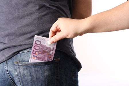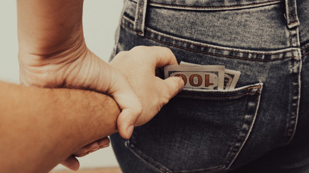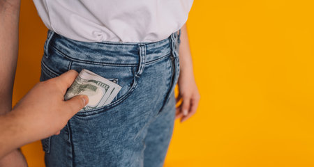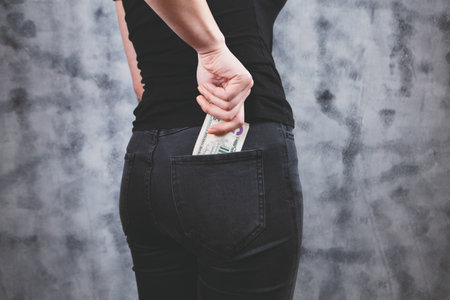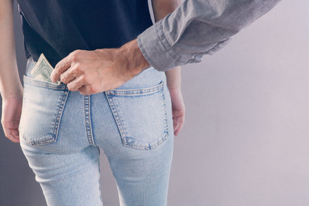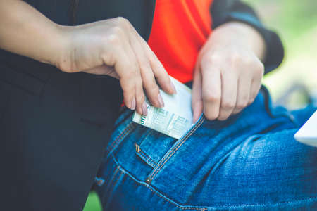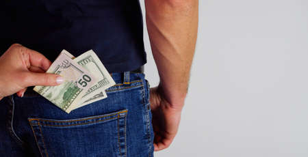 The woman pulls money out of the back pocket of the standing man's blue jeans. Close-up view of the hands. Place for your text.