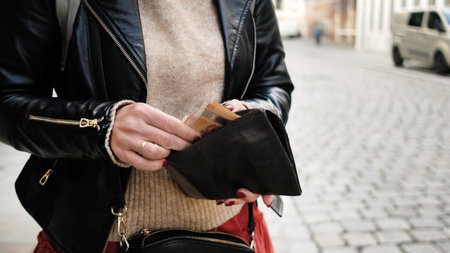 Stylish Female Counts Euro Cash Money In Wallet On City Street