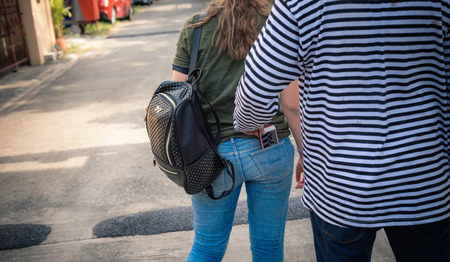 Street thief stealing money from back pocket of jeans woman., Robber, Thief concept