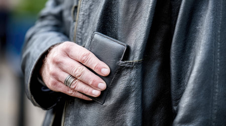 A close-up view captures a hand placing a small wallet into a leather jacket pocket, showcasing rich textures and modern style in an urban setting.