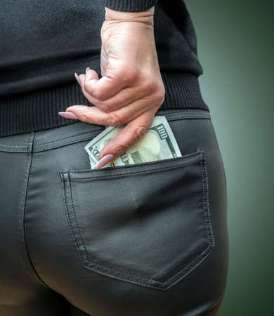 Woman hand taking money from jeans back pocket. Woman hiding money behind her back. Dollar banknotes close up
