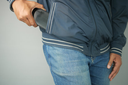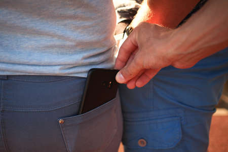 Close-up of a man is hand steals a mobile phone with a jeans pocket. Crime, pickpocketing on the street