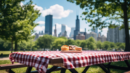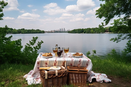 summer picnic in the park, with view of the lake and green trees in the background, created with generative ai