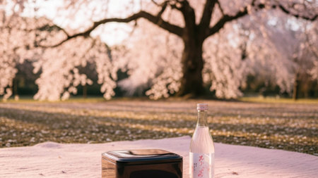 Bottle of sake in the park with cherry blossoms in the background