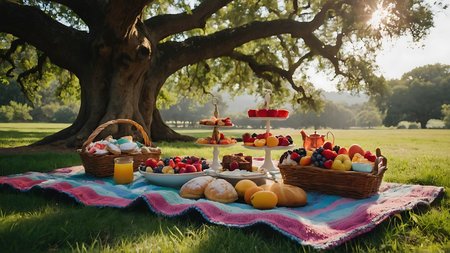 family-friendly picnic setup in a beautiful park setting, created with generative ai